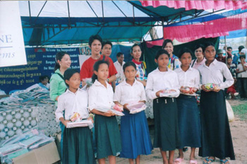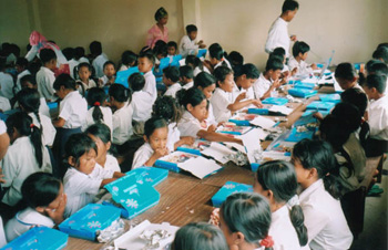 Ms. Umarat Vichittarat, Ms. Arisra Sangrit and members of her delegation give a packet of school supplies and snakes to students.