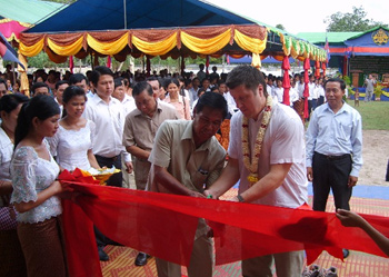 H.E. Sok Bon and Patrick Newell cut the last part of red ribbon to inaugurate the new school building, on 21 October, 2008.